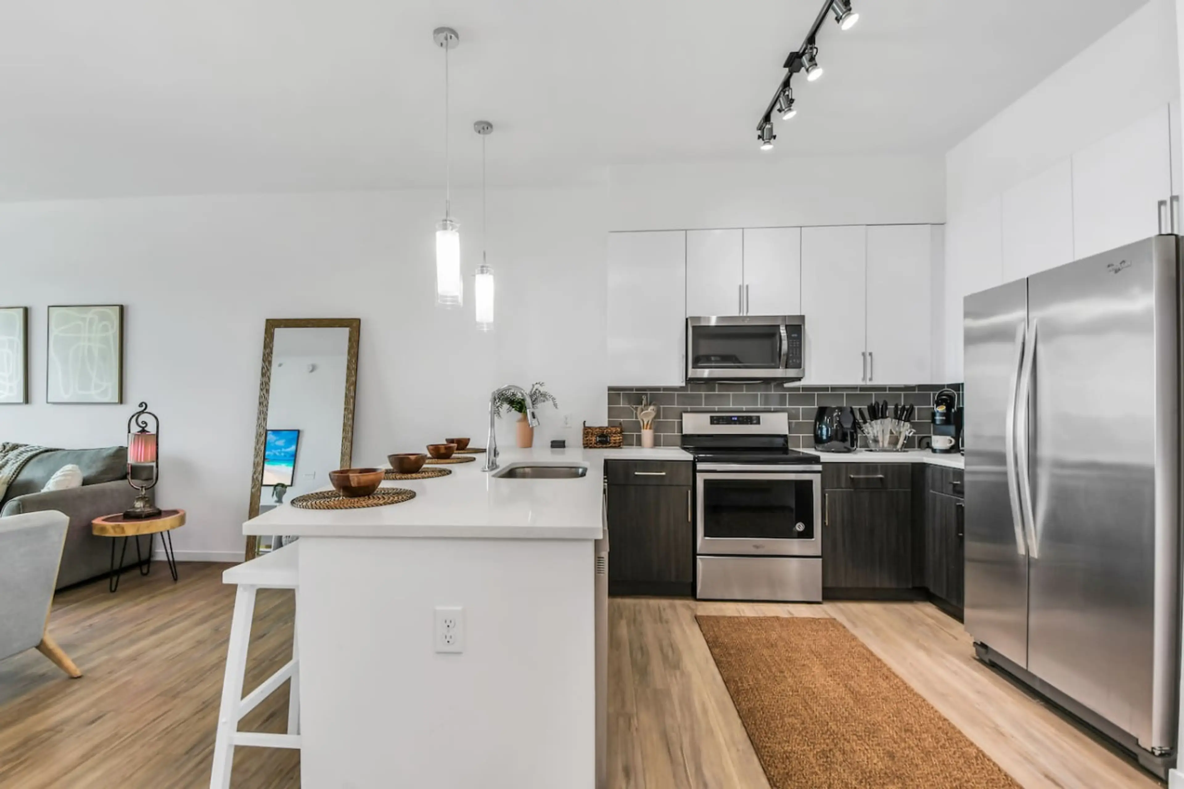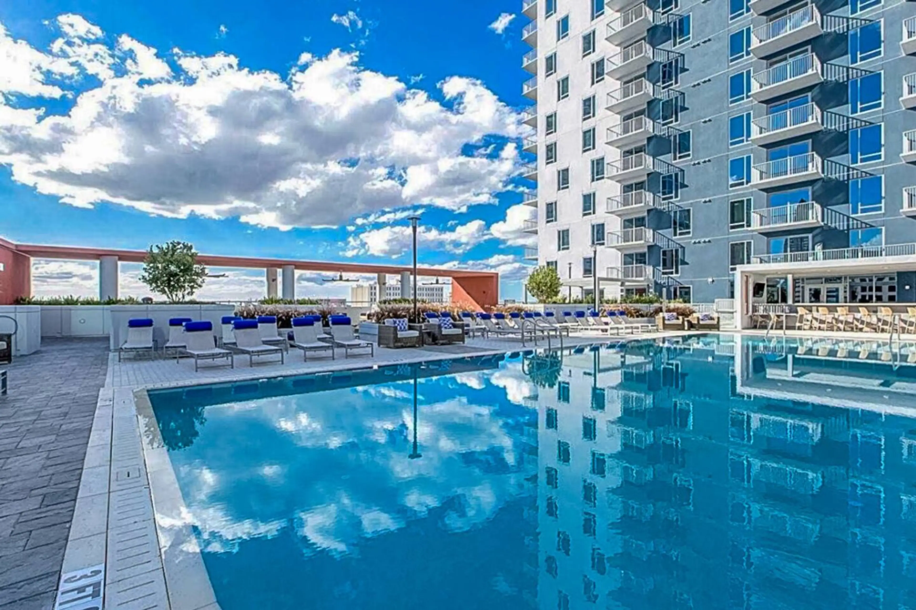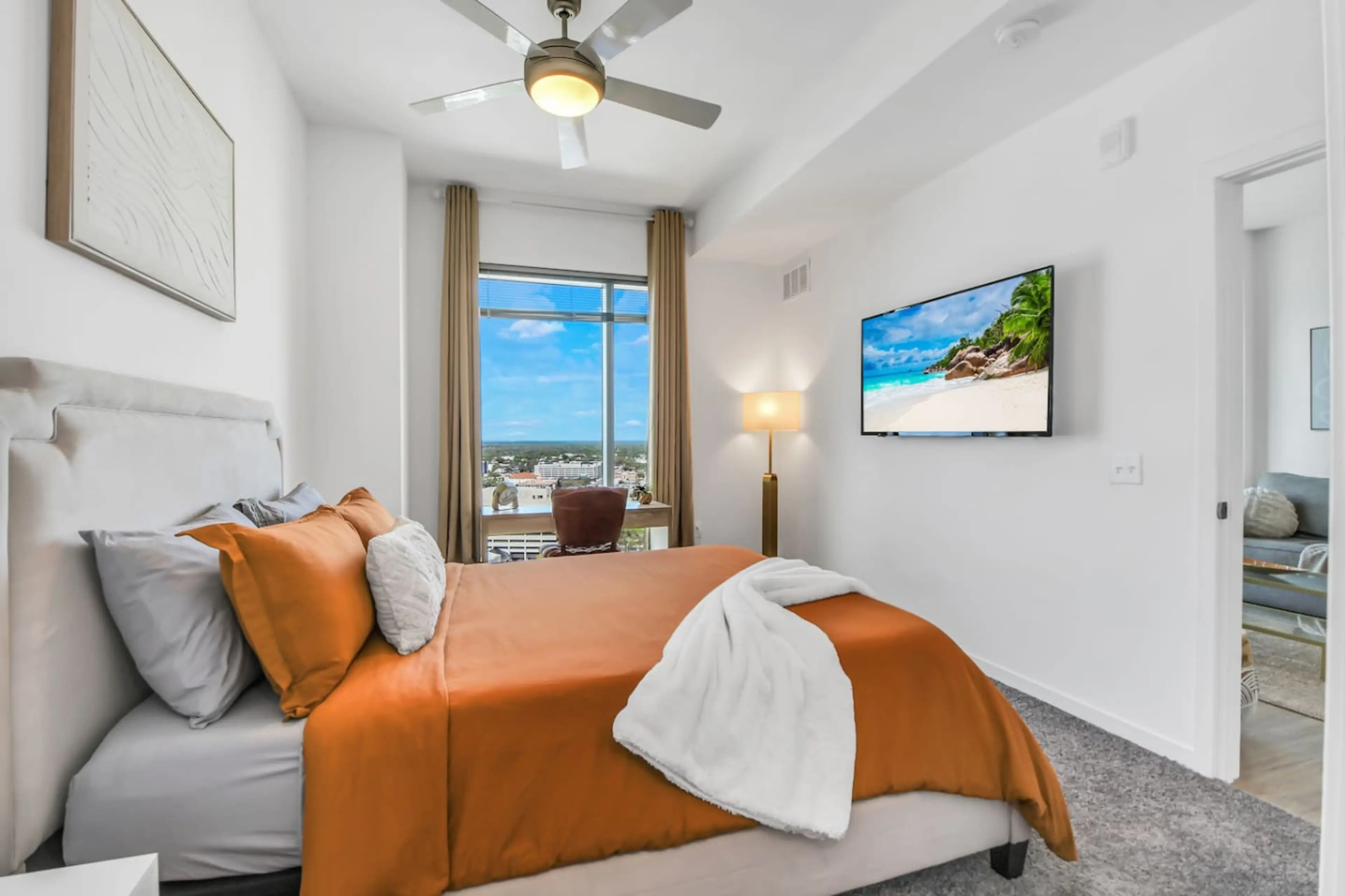 Experience the city from this modern high-rise retreat overlooking the downtown skyline. Wake up to sweeping city views, enjoy morning coffee on your private balcony, and unwind in a stylish open living space filled with natural light. Guests also enjoy access to premium building amenities includin...